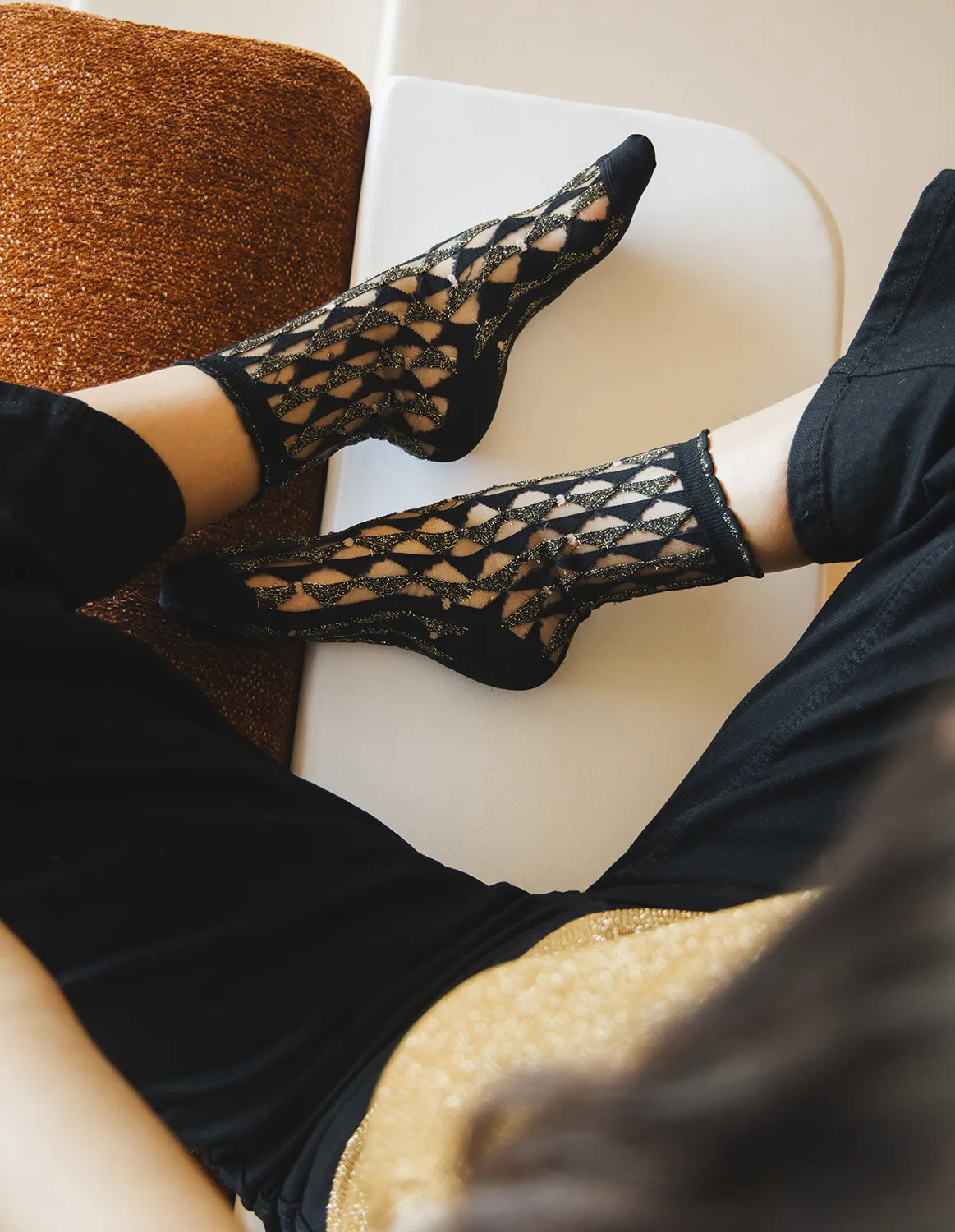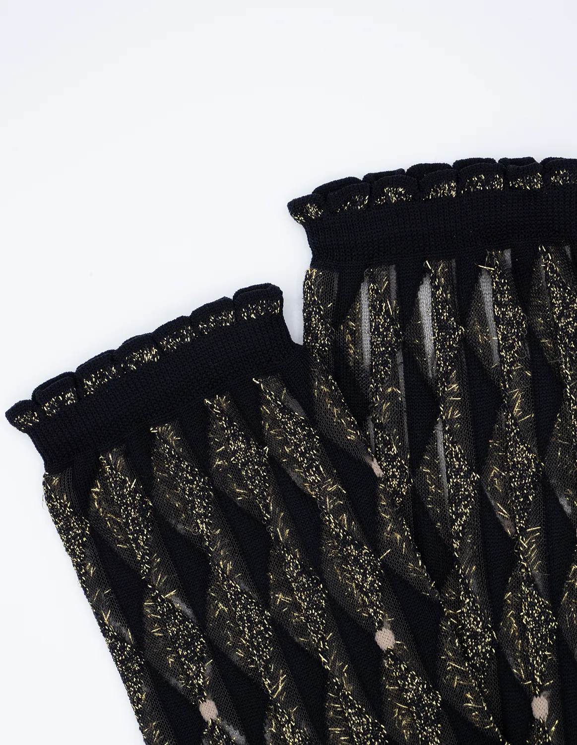 Det gyldne mønster leger med lys og skygge og slynger sig organisk omkring foden og anklen i et elegant grafisk spil, der både fanger opmærksomheden og forbliver subtilt. Meshmaterialet giver en let, næsten vægtløs følelse mod huden, som gør strømperne behagelige at have på – uanset om du går til hverdag eller til fest. Farven gylden er varm og inviterende og tilføjer et strejf af luksus og raffinement til enhver styling.