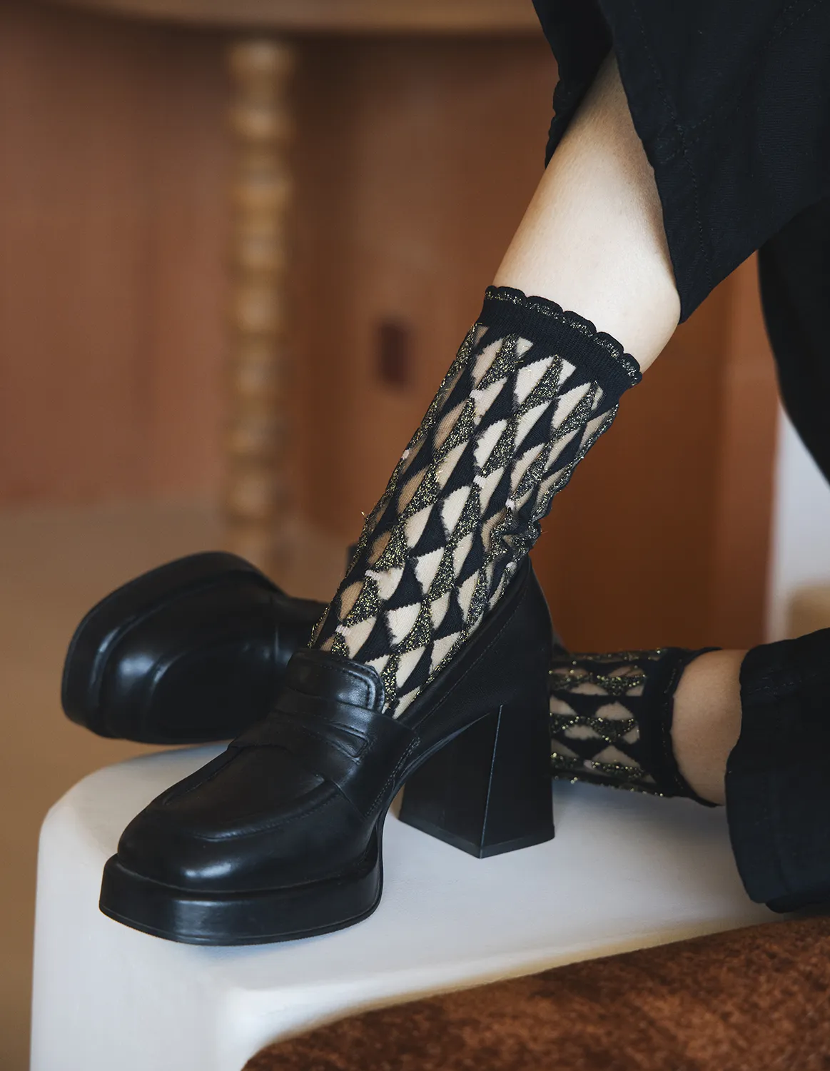 Arlecchino Dorée-strømperne fra Atelier St Eustache er en hyldest til den klassiske italienske commedia dell’arte-figur Arlecchino, kendt for sine farverige lapper og legende personlighed. I denne moderne fortolkning skaber det gyldne mønster en sofistikeret, men livlig kontrast til den transparente mesh, som omfavner foden med lethed og elegance. Inspirationen til designet trækker tråde til både historisk teater og nutidens urbane kunst, hvor farver og former kombineres i en harmonisk og samtidig dynamisk symfoni.