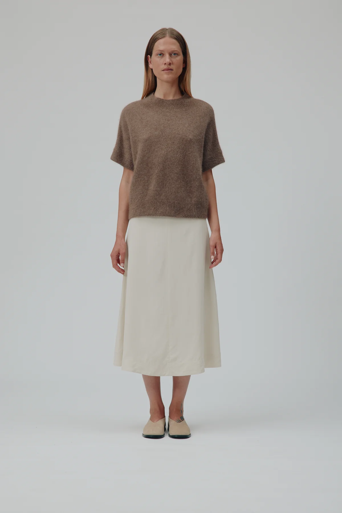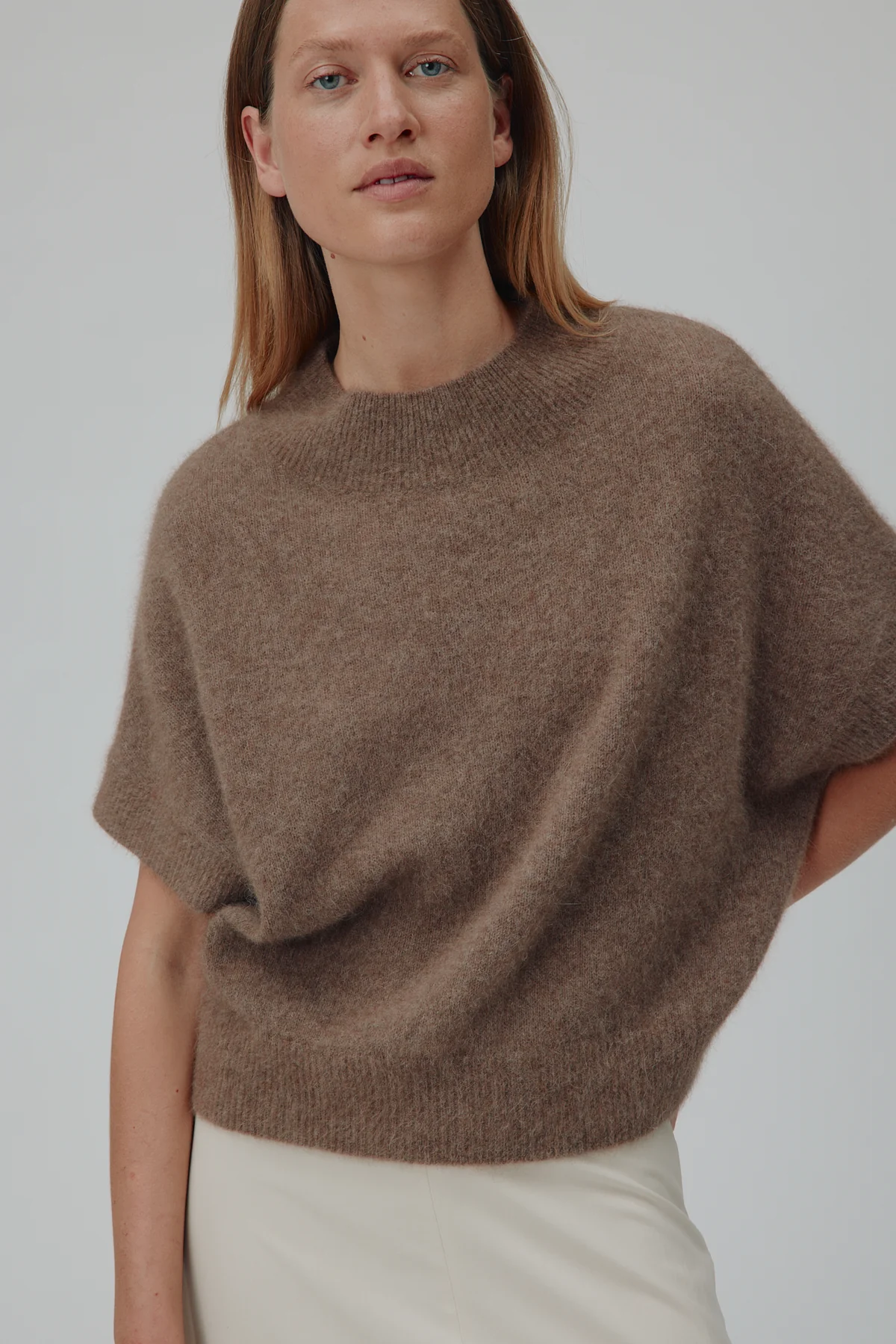 Doanna Sweater i farven Acorn Melanger fra Six Ámes er et elegant og luksuriøst strik, der kombinerer skandinavisk minimalisme med varme og komfort. Sweateren er fremstillet i 100% raccoon wool (vaskebjørnsuld) – et blødt, naturligt materiale, der holder dig varm, er let at have på og regulerer temperaturen, så du føler dig behagelig fra morgen til aften.