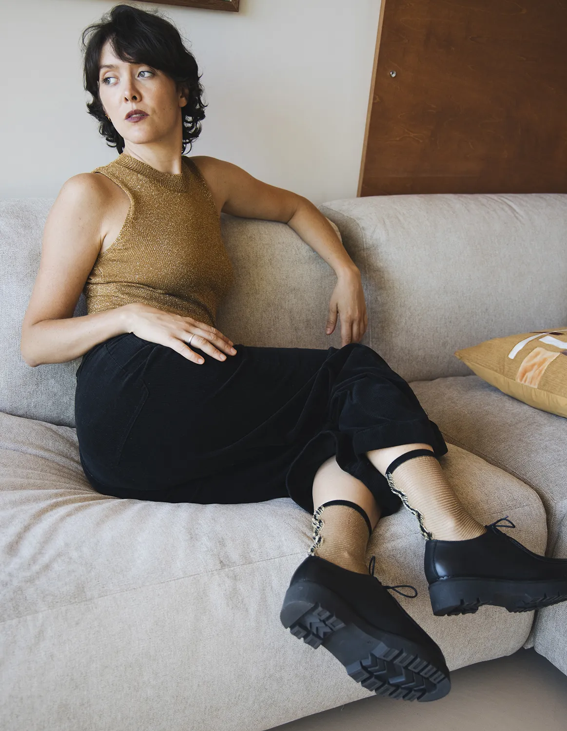 Frangia Dorée er ideelle til dig, der ønsker et grafisk, moderne udtryk med tidløs elegance. Strømperne kan styles med sneakers, loafers, sandaler eller stilletter og tilfører ethvert outfit et urbant og sofistikeret præg. Uanset om du ønsker at tilføje et subtilt touch til hverdagslooket eller fuldende et elegant aftentøj, skaber Frangia Durée en balance mellem minimalistisk design, grafiske detaljer og moderne raffinement.