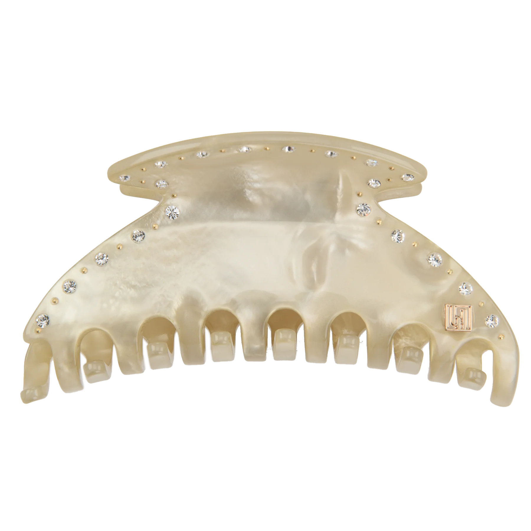 Bon Dep Ivory hårklemmer er både funktionelle og stilfulde accessories til håret, tilgængelige i to størrelser: 6,5 cm og 9 cm. Den mindre 6,5 cm-klemme er ideel til finere hår eller mindre sektioner, mens den større 9 cm-version med Swarovski-sten langs kanten tilføjer et luksuriøst og glimtende touch til enhver frisure.