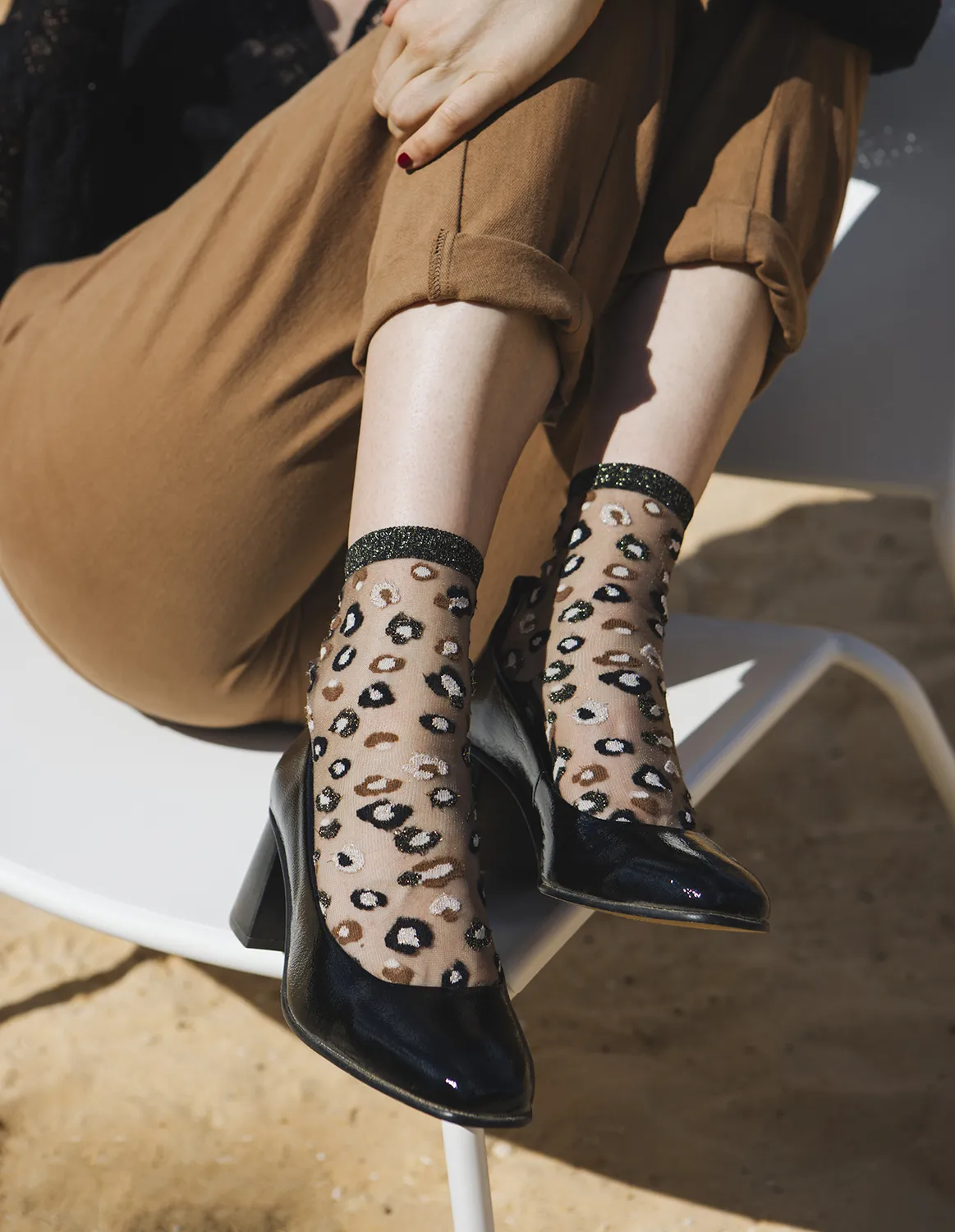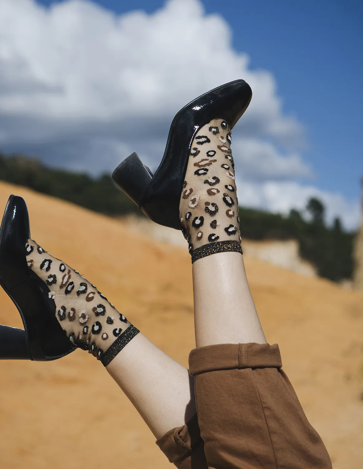 Horseshoe Bend Gold-strømperne fra Atelier St Eustache er en smuk hyldest til naturens organiske former og det gyldne lys, der reflekteres i de ikoniske kløfter i det amerikanske Southwest. Inspireret af den dramatiske bøjning af Coloradofloden snor det grafiske mønster sig blødt og naturligt omkring foden og anklen.