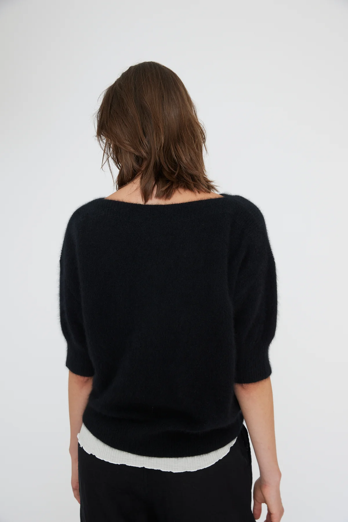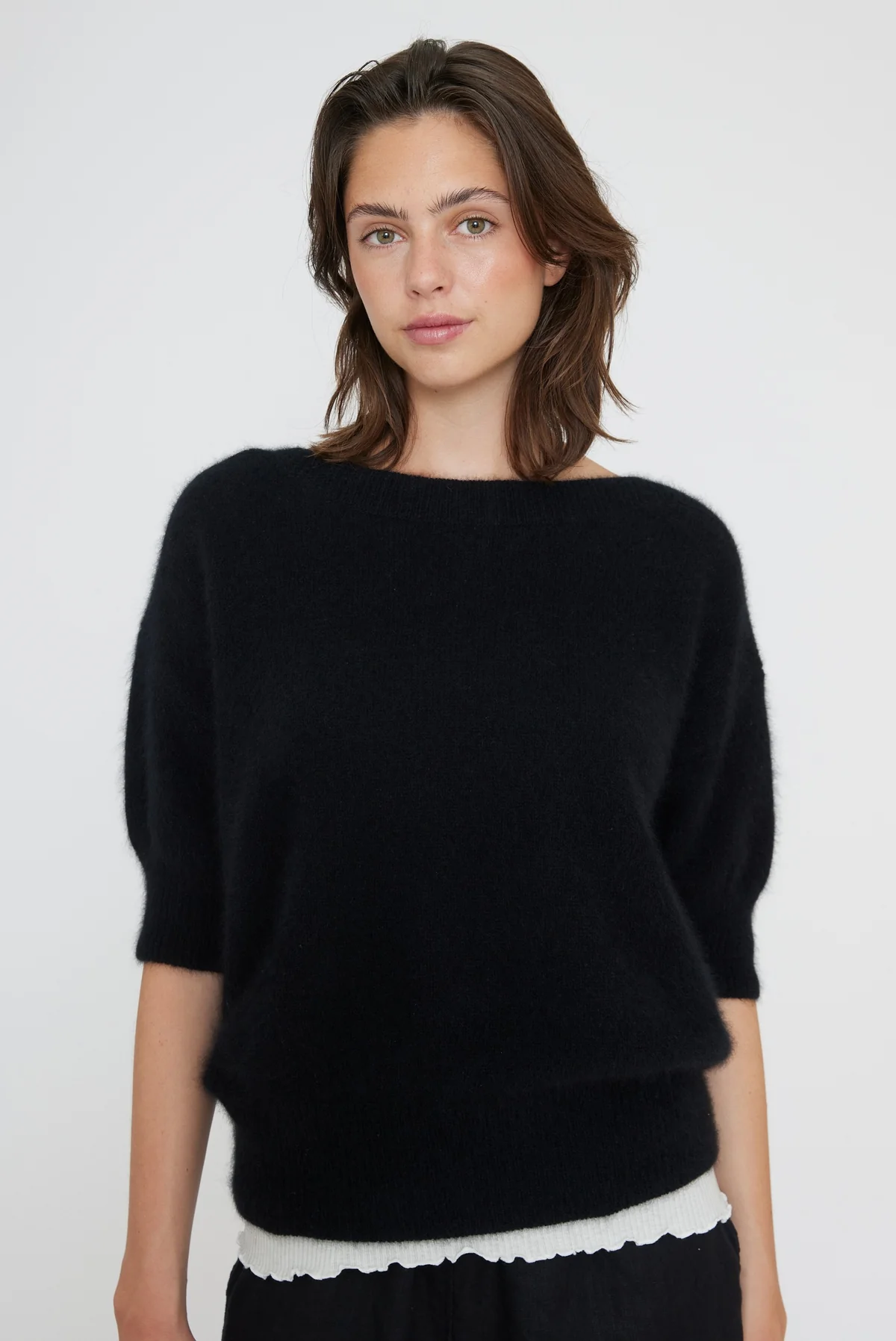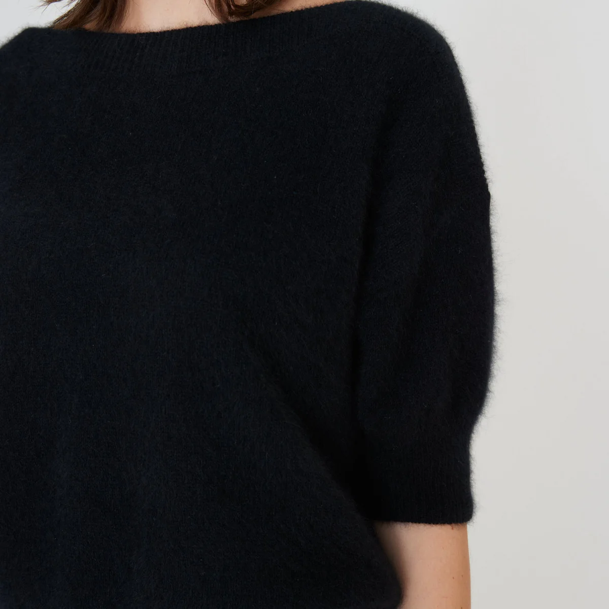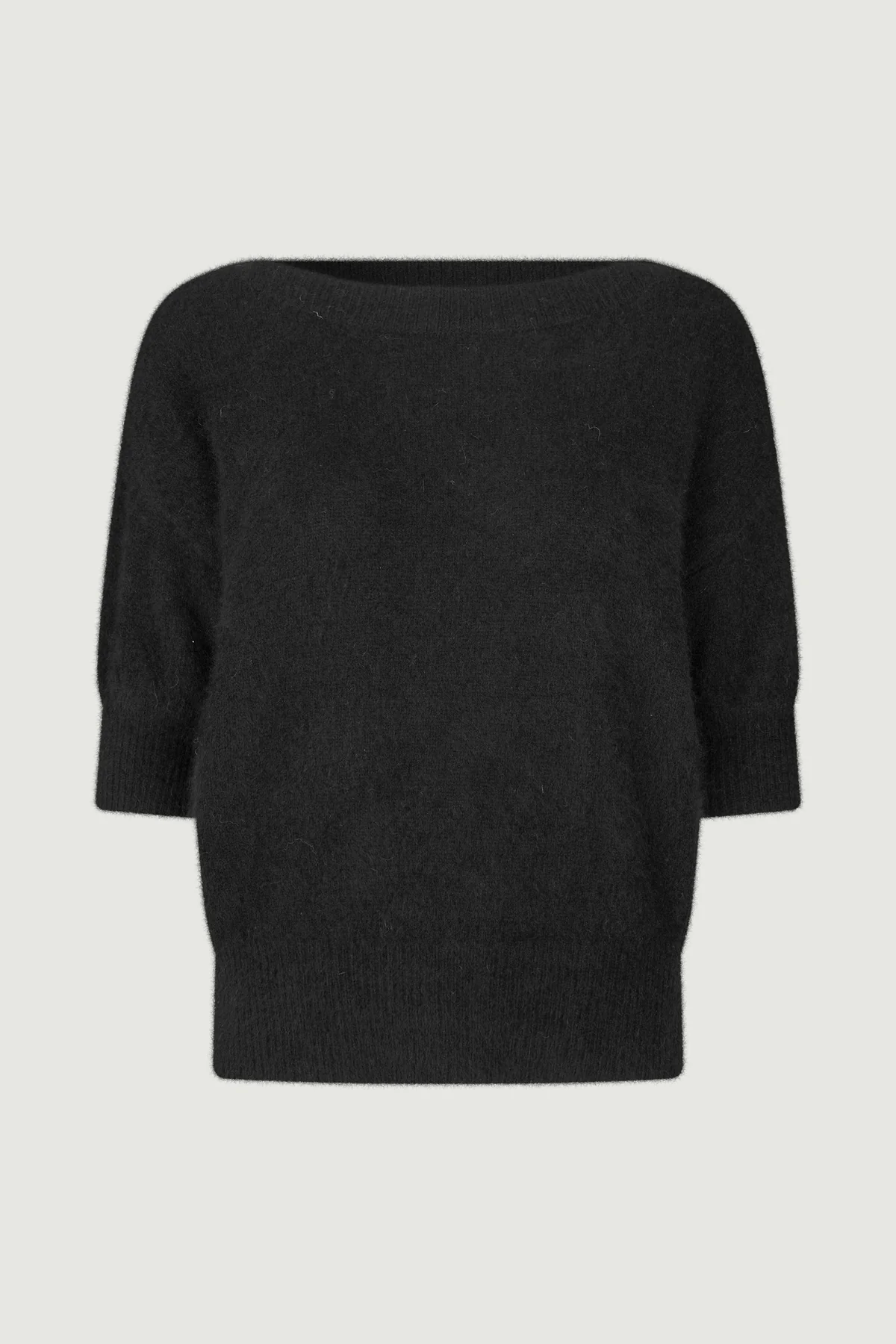 Moi Sweater fra Six Ámes i farven Black er en tidløs og luksuriøs strik fremstillet i 100% vaskebjørnsuld (raccoon wool). Den bløde og varme kvalitet gør sweateren behagelig at bære hele dagen, samtidig med at den holder sin form og elegance sæson efter sæson.