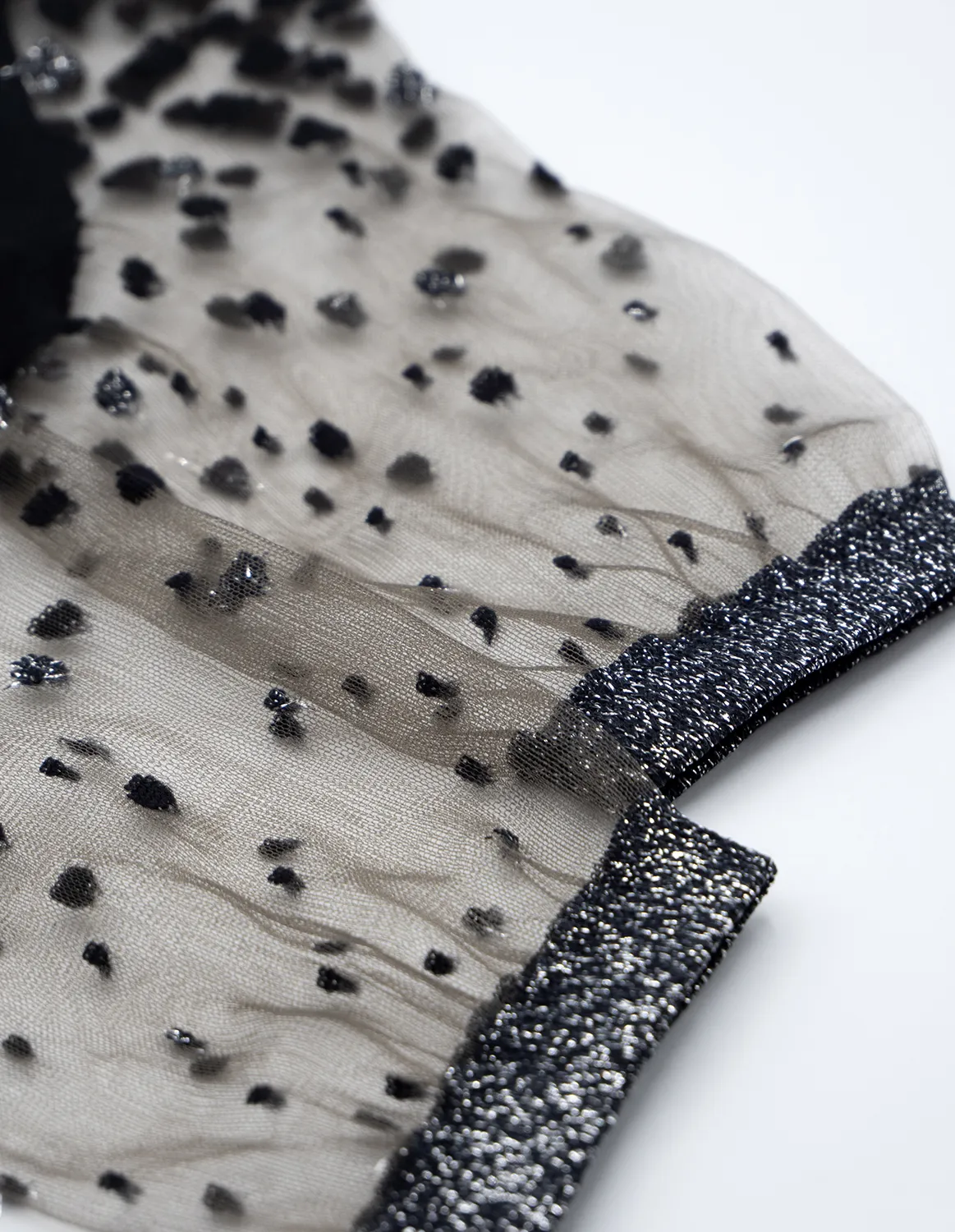 Strømperne er konstrueret på et transparent mesh, der skaber en næsten svævende visuel effekt omkring foden. Udtrykket i stømperne er moderne og tidløst – perfekt, når du vil løfte et simpelt outfit eller tilføje en luksuriøs detalje til et mere elegant look.