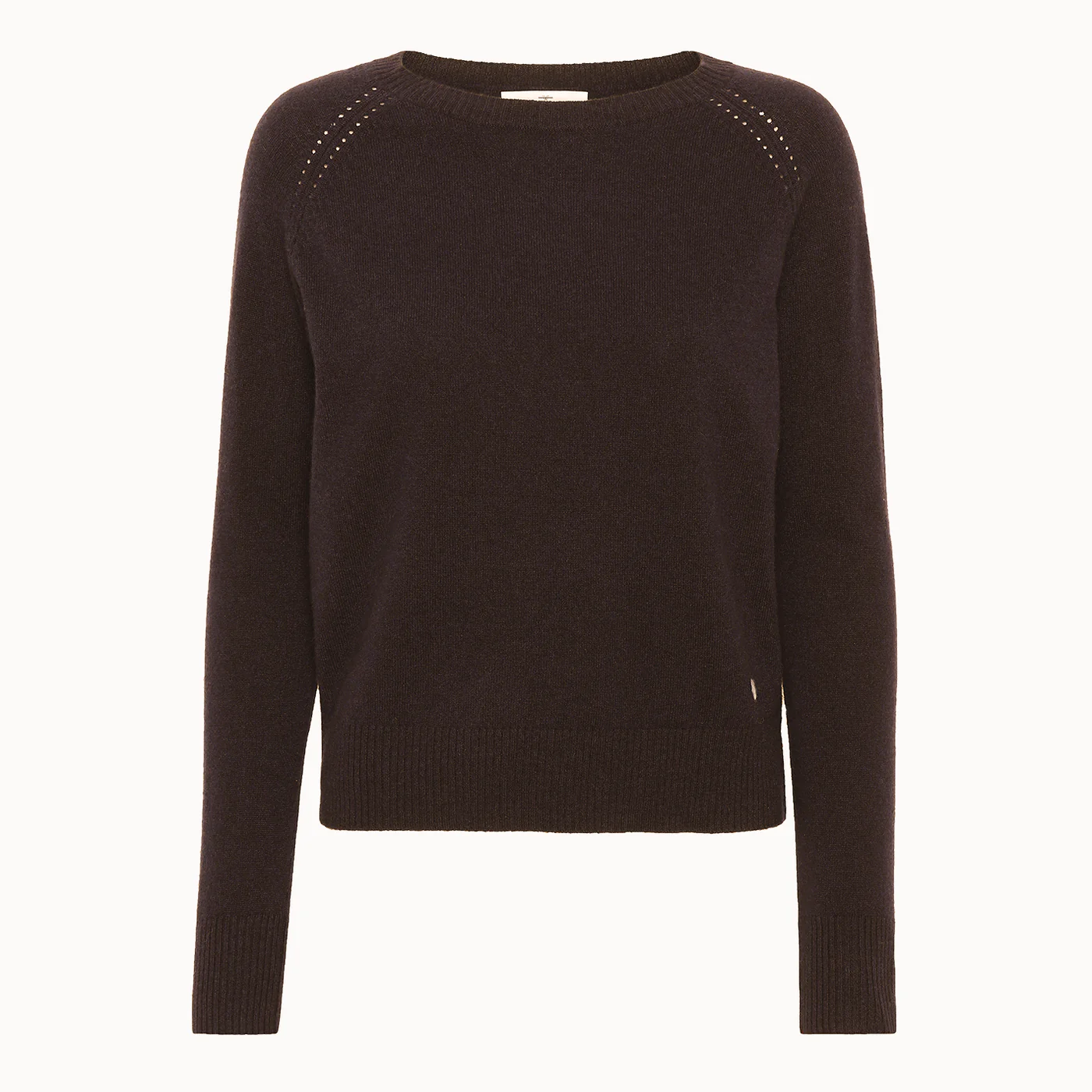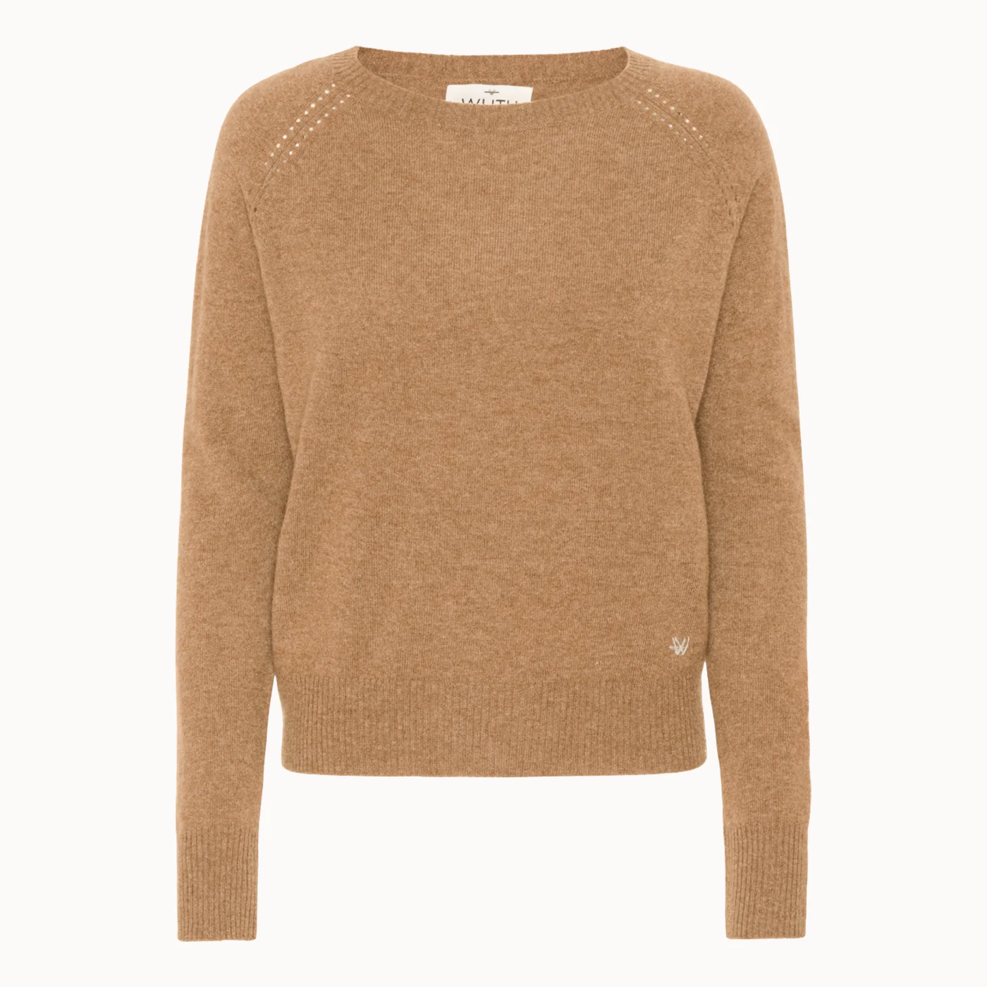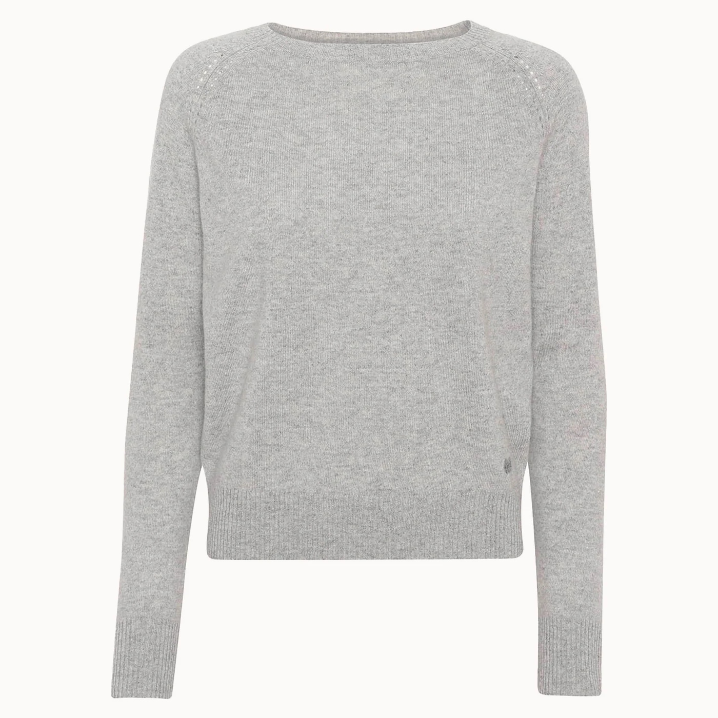 Den semi-bådformede halsudskæring og de lange raglanærmer skaber et sofistikeret look, mens fine pointelle-detaljer ved skuldrene tilfører et diskret og elegant touch. Resultatet er en tidløs strik, der kan bruges sæson efter sæson.