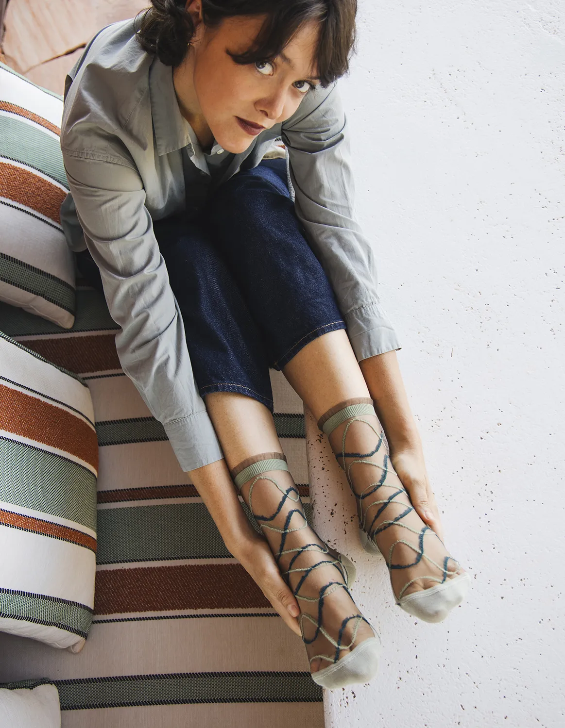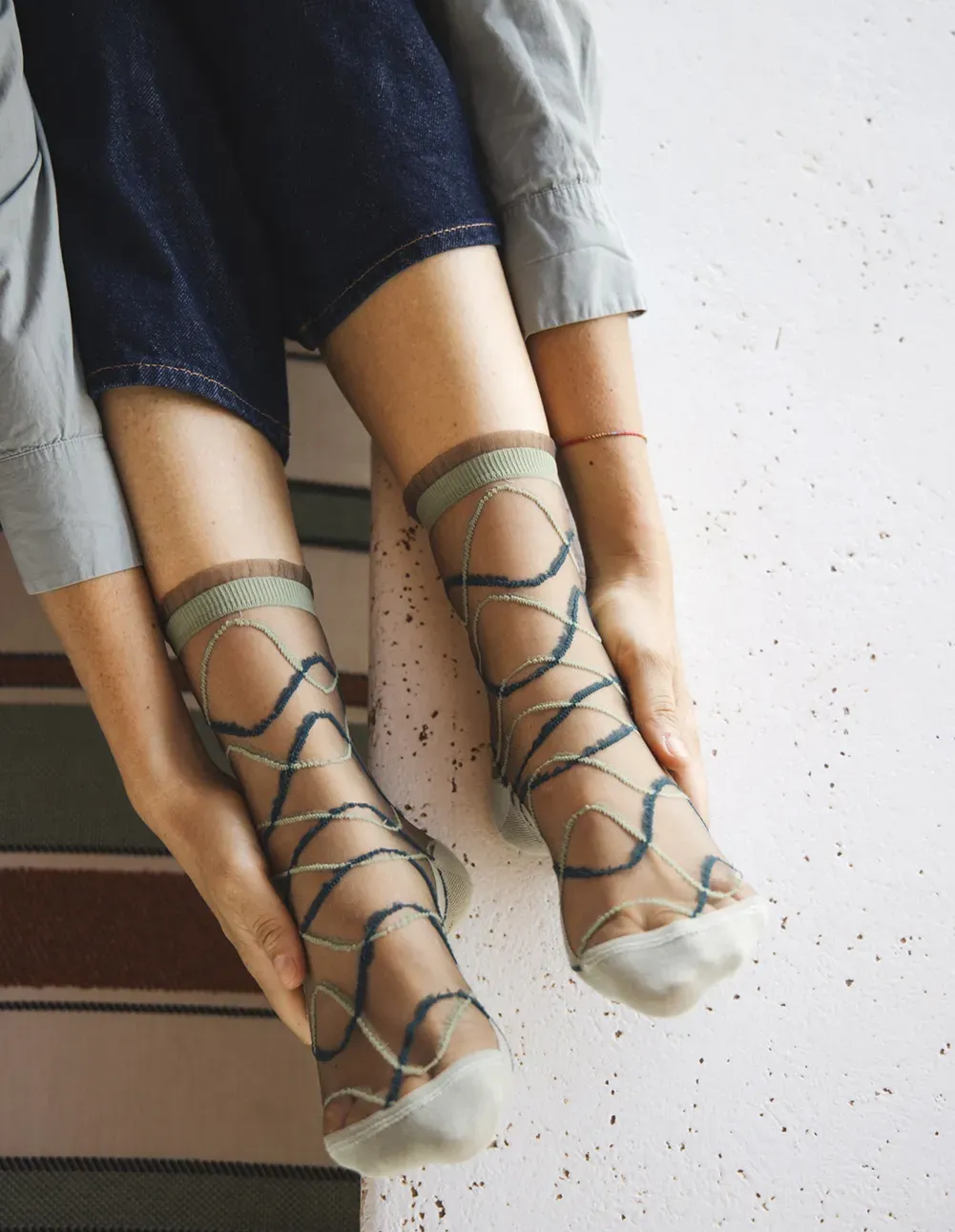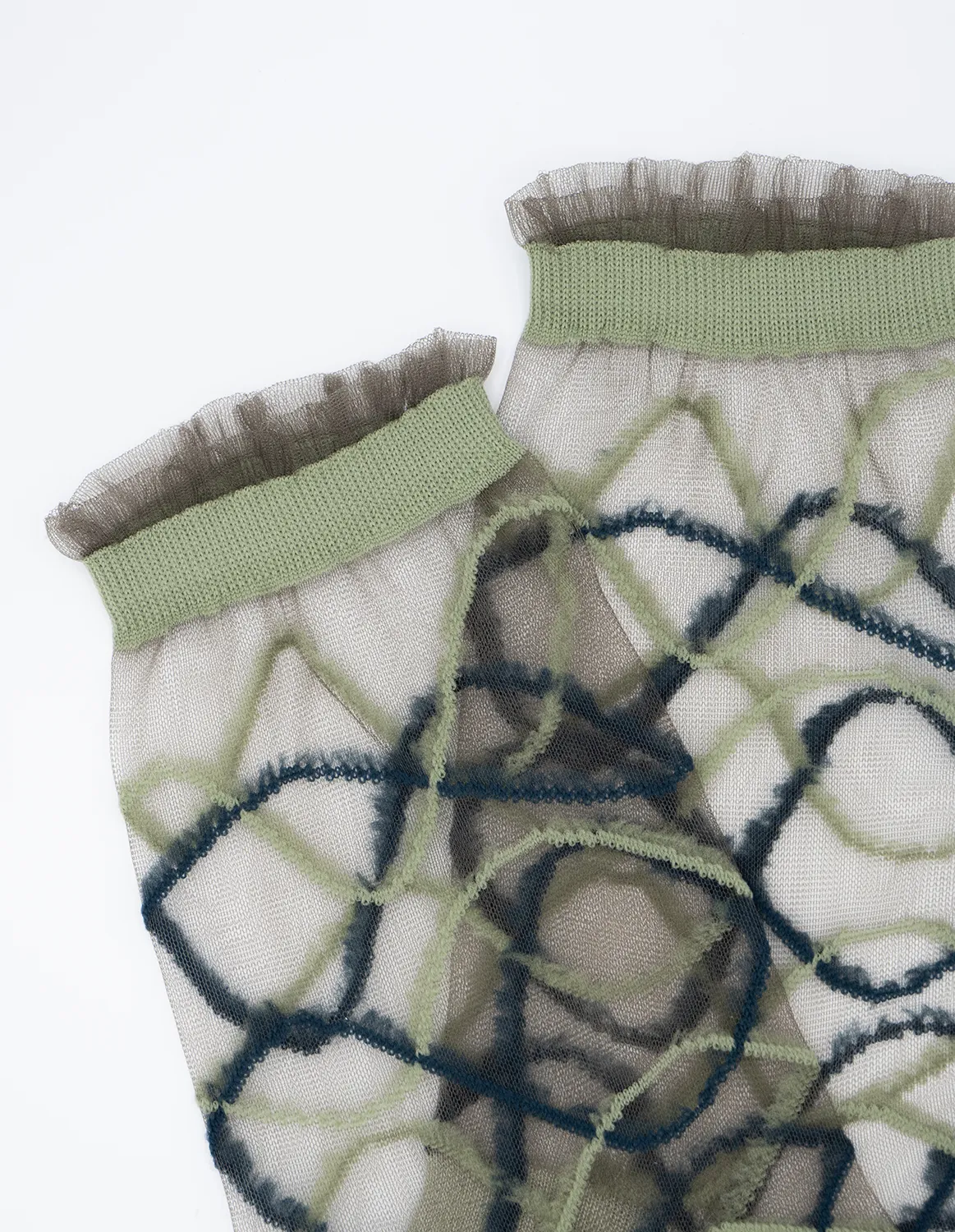 Riflessi Sauge fra Atelier St Eustache kombinerer moderne minimalisme med et grafisk salviegrønt mønster, der giver strømperne et sofistikeret og harmonisk udtryk.