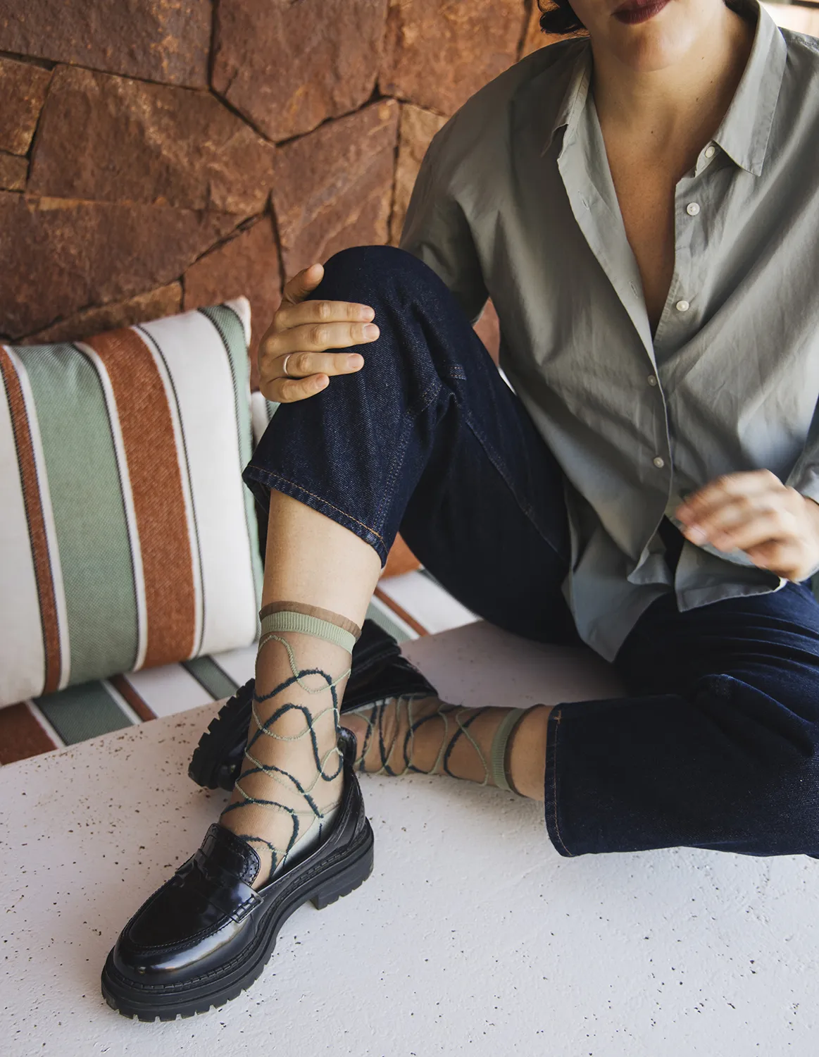 Riflessi Sauge er perfekte til dig, der ønsker et grafisk, moderne udtryk med en blød, naturlig farvetone. Den salviegrønne nuance tilfører strømperne et eksklusivt og stilfuldt præg, der kan kombineres med alt fra sneakers og loafers til sandaler og stilletter. Uanset om du ønsker at give et casual outfit et sofistikeret touch eller fuldende et elegant aftentøj, skaber Riflessi Sauge balance mellem minimalistisk design, urbane referencer og tidløs elegance.